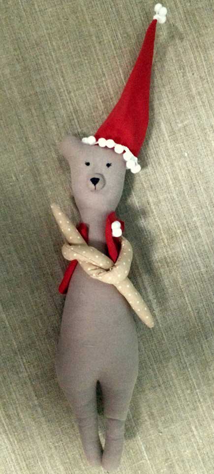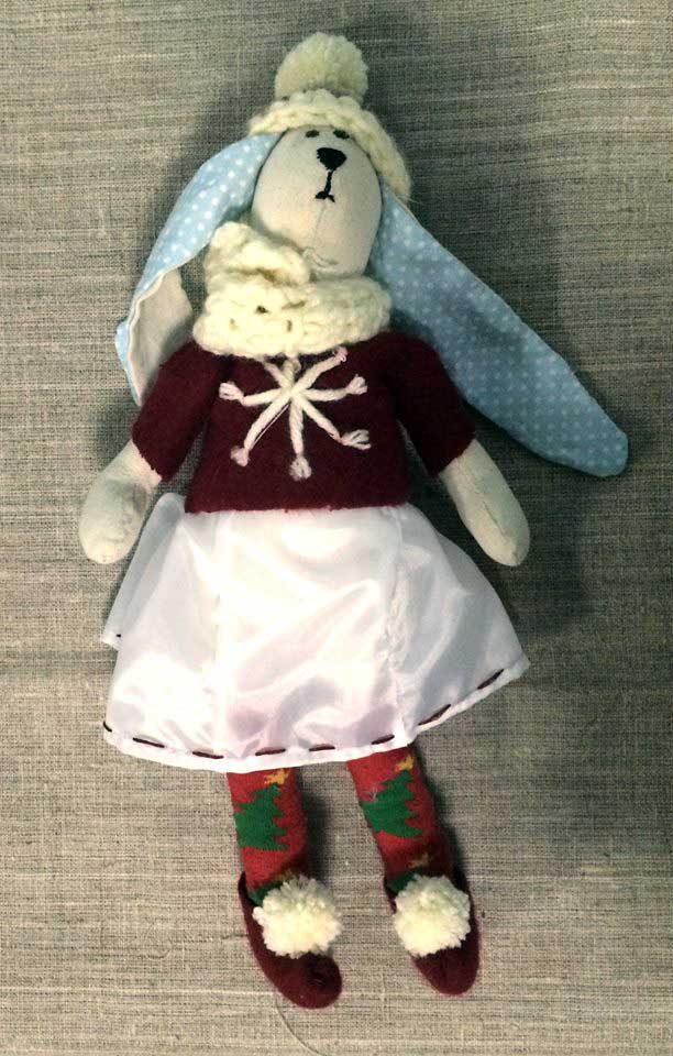 | Мягкая игрушка Заяц плюс одежда Мухамедьярова Соня. 8 класс | Мягкая игрушка Медведь новогодний Корецкая Ира 8 класс |