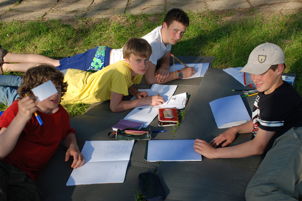 Вторую половину недели мы посвятили географии: разбились на группы и сделали план-карту деревни Александровка, где находился наш лагерь, с использованием пошаговой съемки и масштаба. Каждая группа оформляла свой кусок местности. В итоге мы соединили и получили общую карту с единым масштабом.