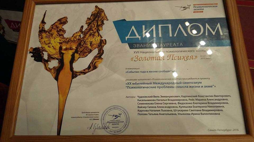 5-7 июня 2016 года в рамках работы 10-го саммита психологов (г. Санкт-Петербург) состоялось награждение победителей и лауреатов национального конкурса «Золотая Психея». Нужно напомнить, что научно-образовательный проект для старшеклассников в ПИ РАО, в котором принимали участие наши старшеклассники, в 2014 году вышел в финал и стал Лауреатом. В этом году звание Лауреата было присвоено Юбилейному XX Симпозиуму «Психологические проблемы смысла жизни и акме», проходившему в апреле 2015 года. На награждении присутствовала библиотекарь нашей школы, канд. психол. наук Екатерина Николаевна Кулешова. Подробности конкурса – здесь